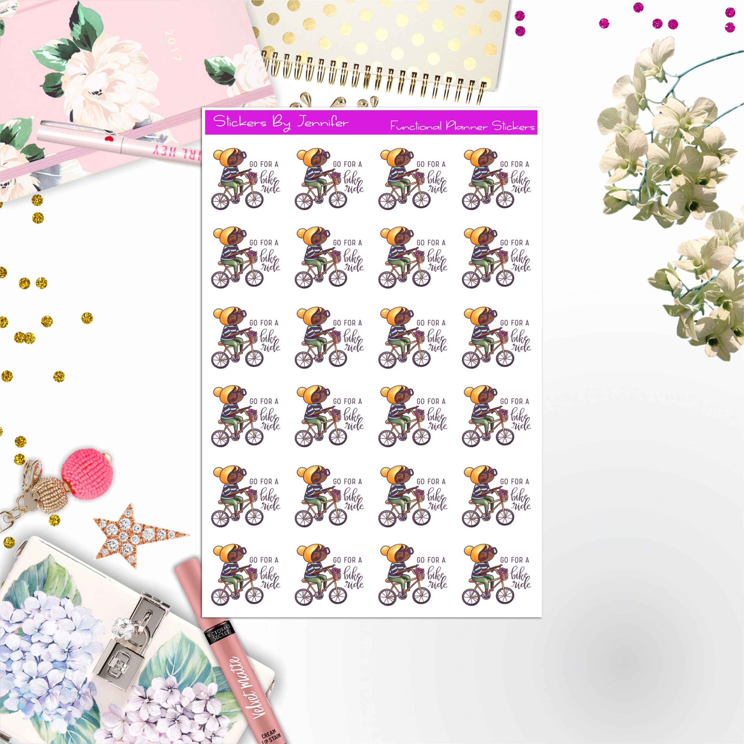 Bike Ride Character Girl Stickers, Planner Stickers, Journal Stickers, Functional Planner Stickers, Stationary Stickers