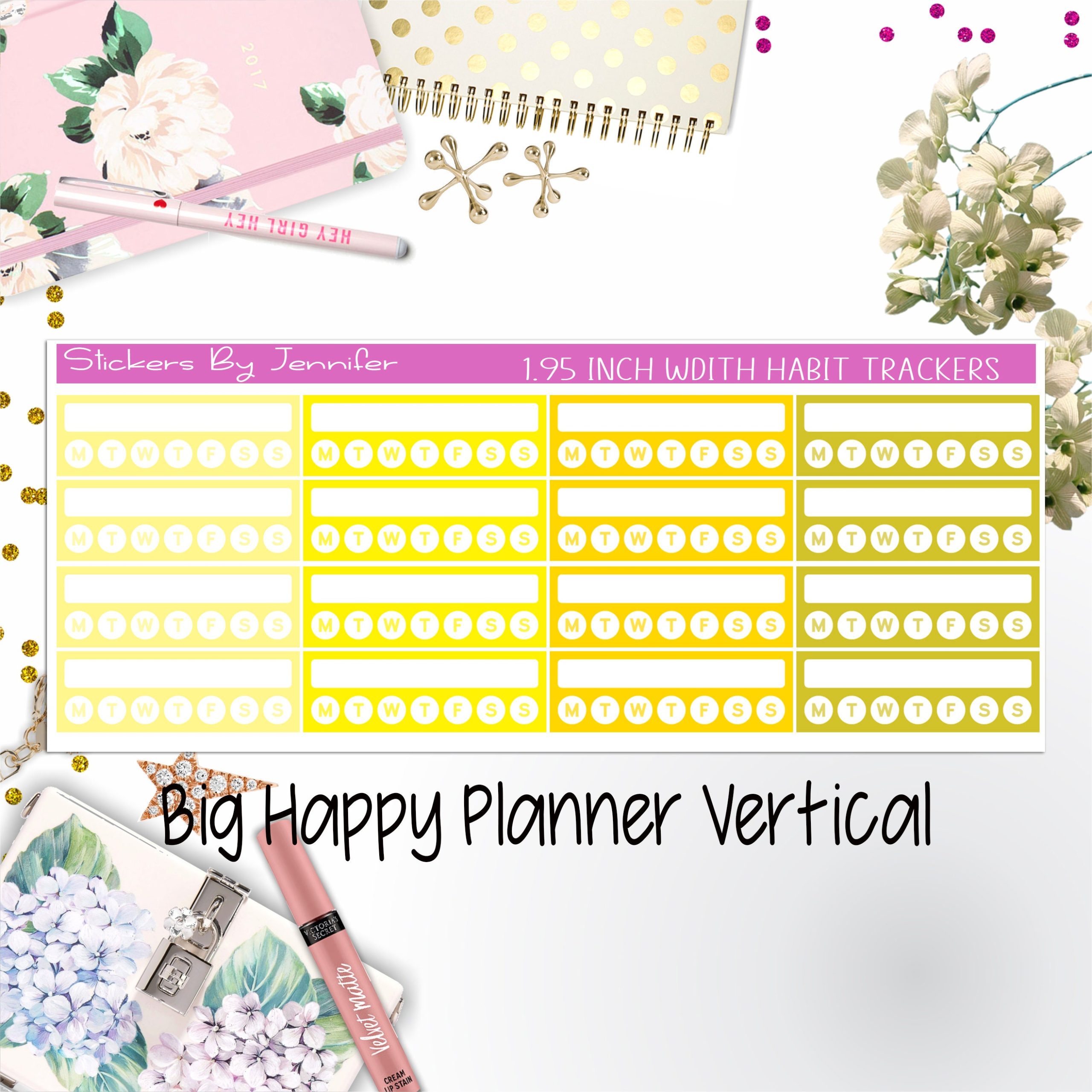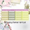 Each sticker is measured 1.95 width. The stickers are sized to fit Vertical Big Happy Planners.