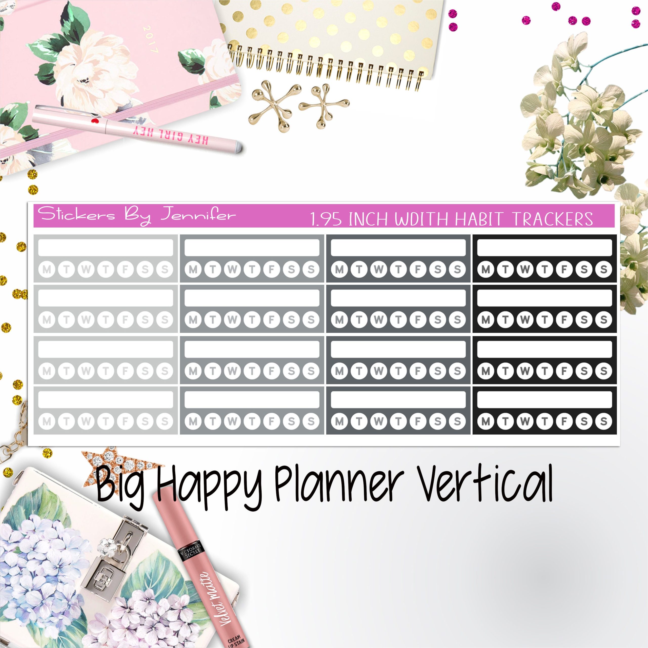 Each sticker is measured 1.95 width. The stickers are sized to fit Vertical Big Happy Planners.
