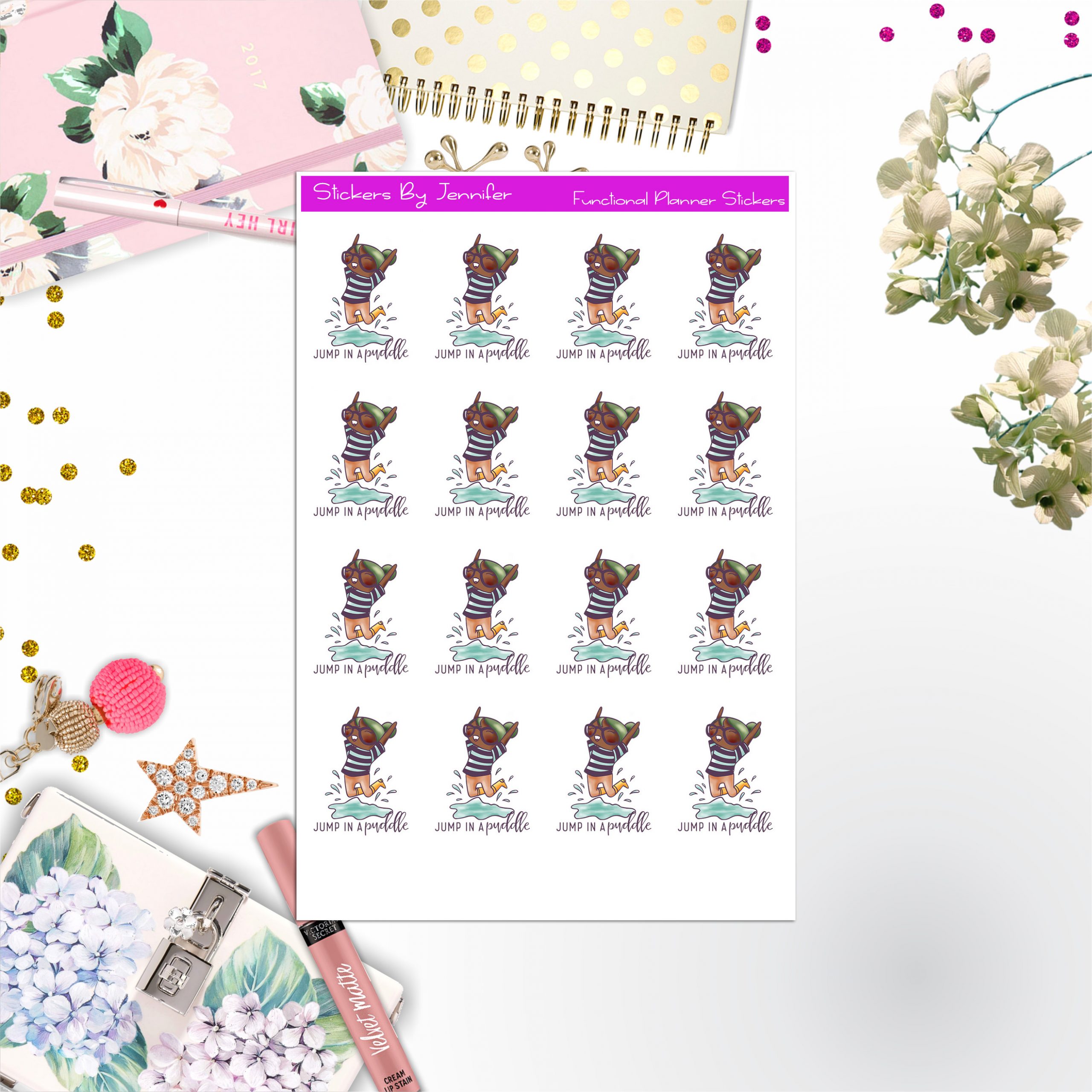 Jump In A Puddle Character Girl Stickers, Planner Stickers, Journal Stickers, Functional Planner Stickers, Stationary Stickers