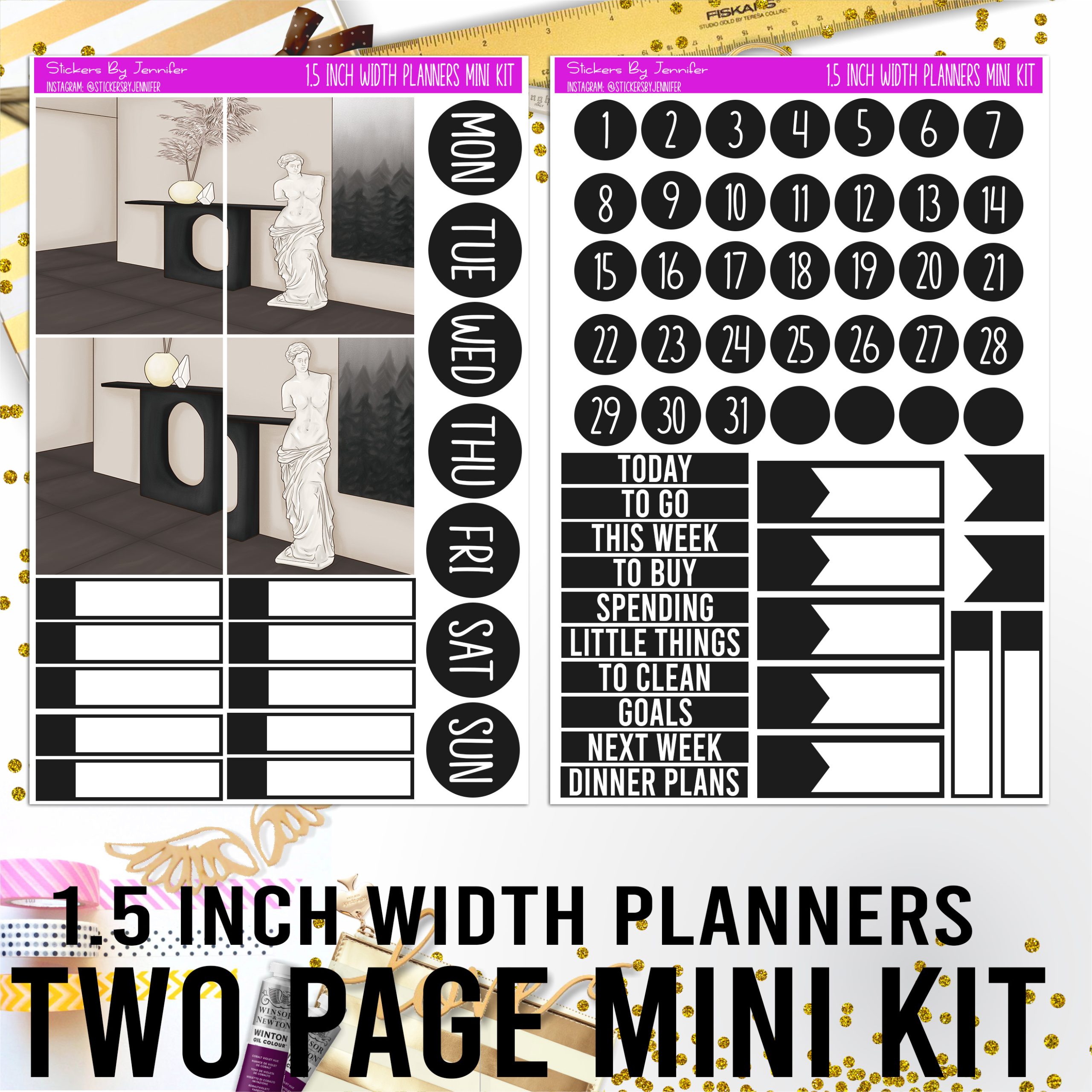Two Page 1.5 Inch Width Mini Kit 003 Planner Stickers, Bullet Journal Stickers, Functional Planner Stickers, Stationary Stickers