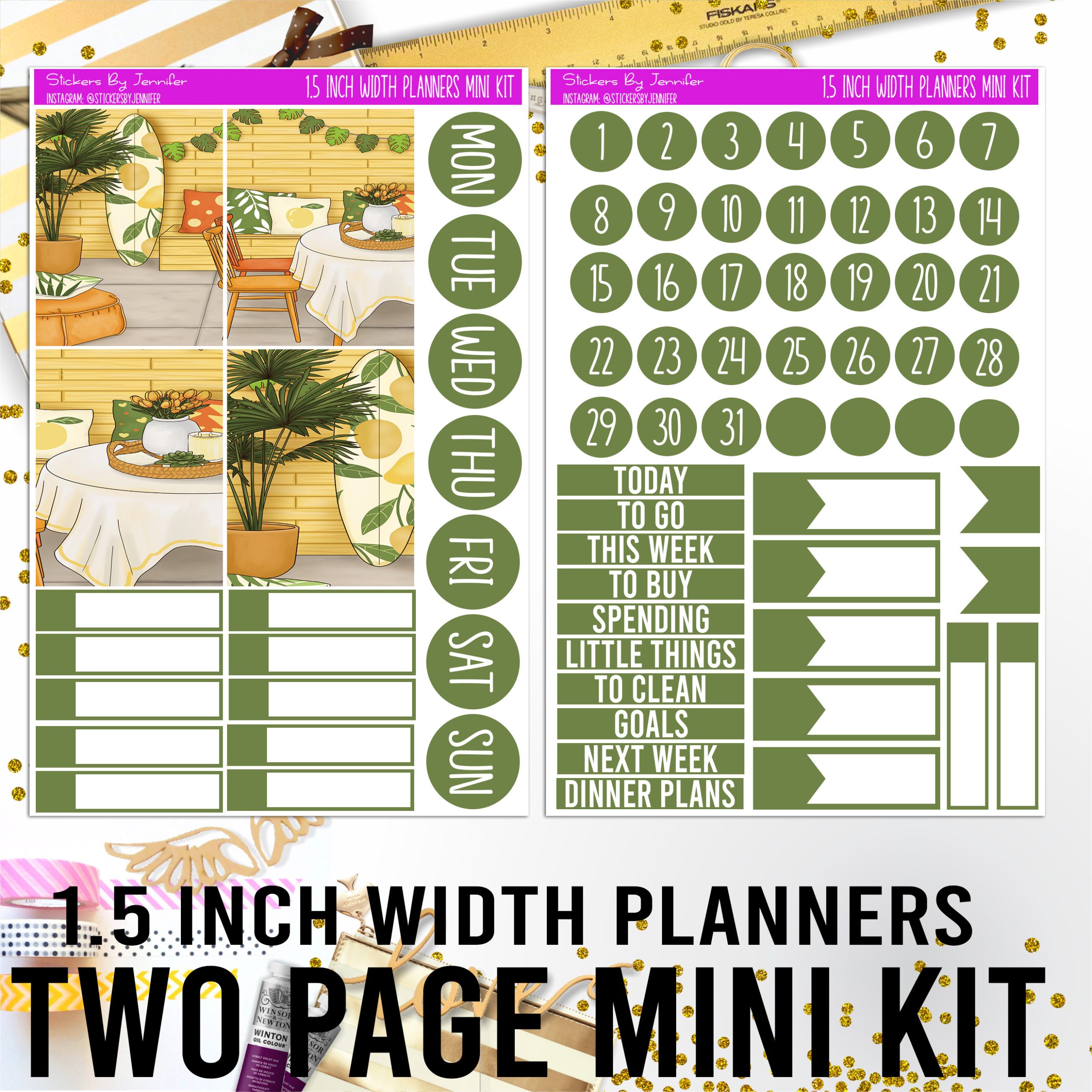 Two Page 1.5 Inch Width Mini Kit 009 Planner Stickers, Bullet Journal Stickers, Functional Planner Stickers, Stationary Stickers