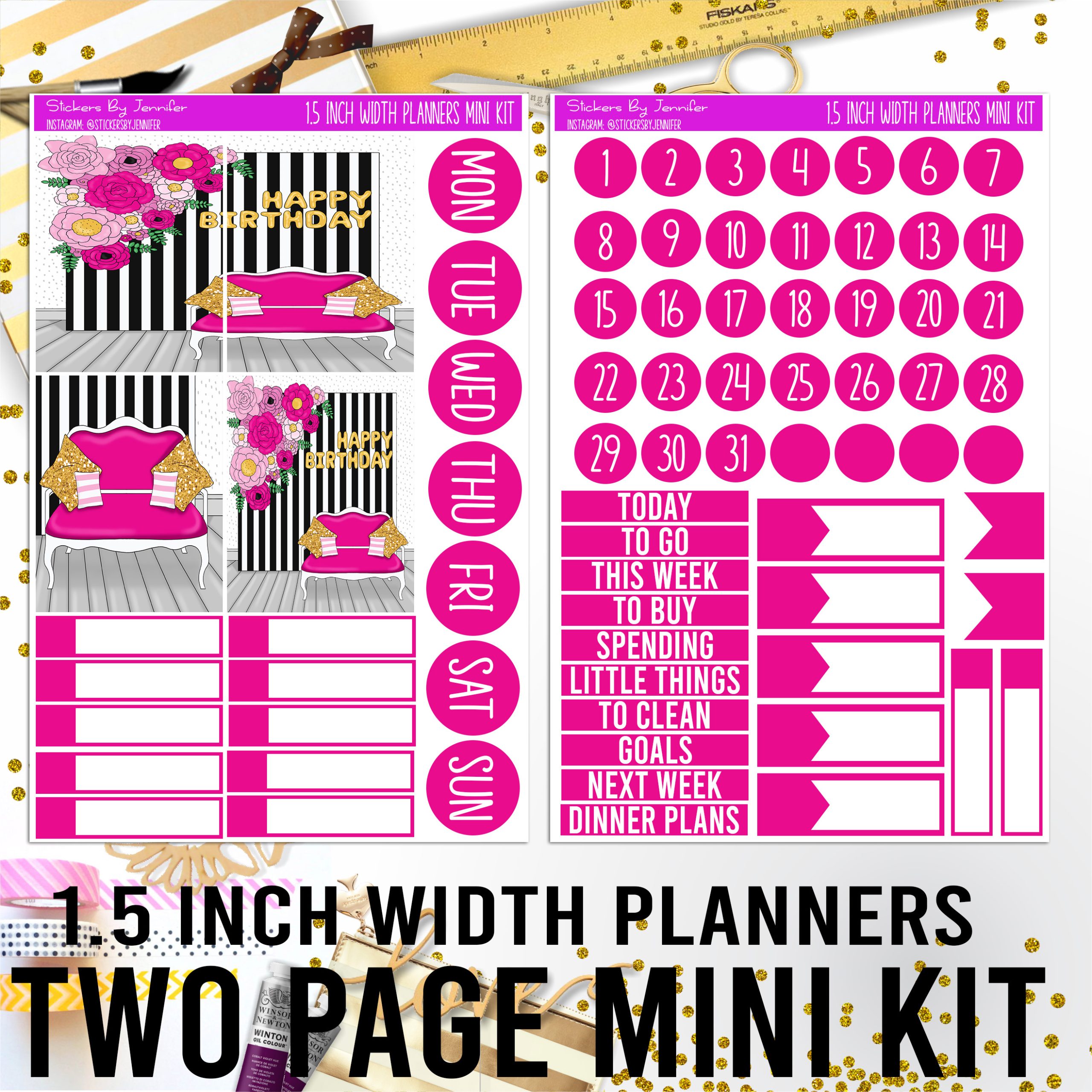 Two Page 1.5 Inch Width Mini Kit 018 Planner Stickers, Bullet Journal Stickers, Functional Planner Stickers, Stationary Stickers